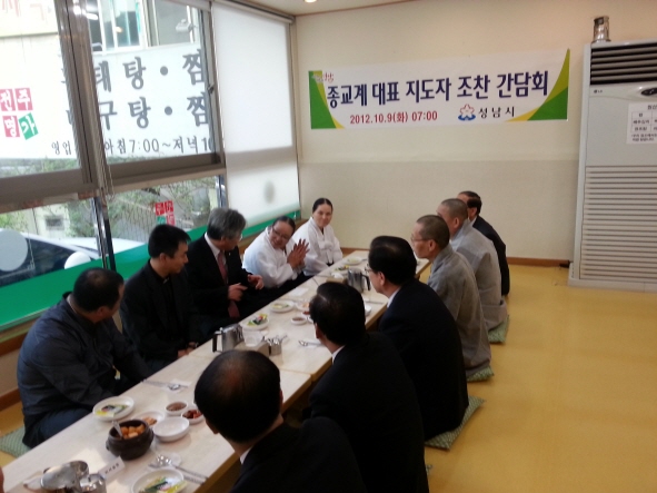 이재명 성남시장은 9일 아침 야탑동 소재 콩나물해장국집에서 종교계 지도자 8명이 참석한 가운데 시정 현안사항 설명과 의견을 수렴하는 조찬 간담회를 가졌다.