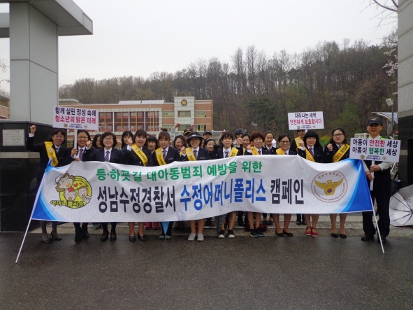 성남수정서는 수정구 관내 14개 초등학교 하교시간대인 낮 12시부터 오후 5시 사이 학교주변 지역을 구호제창 및 가두행진을 하며 대아동범죄예방 순회캠페인을 지속적으로 펼칠 예정이다.