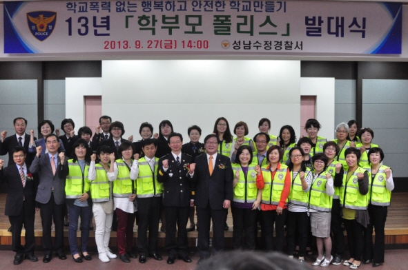 성남수정경찰서(서장 반기수)는 9월 27일 경찰서 5층 수정마루에서 김태년 국회의원, 최윤길 성남시의장, 성남시행정국장, 성남시교육지원청 중등장학사, 관내 중․고등학교 14개 학교장 및 학생부장, 학부모 폴리스 등 총 220여명이 참석한 가운데 “중·고등학교 「학부모 폴리스」 발대식”을 개최하였다.