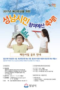 성남시는 시민 의견을 수렴하여 내년도 예산편성에 반영하고자 오는 8월 1일부터 8월 31일까지 2017년 예산편성을 위한 제안사업 접수 및 설문조사를 실시한다.